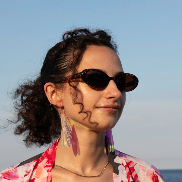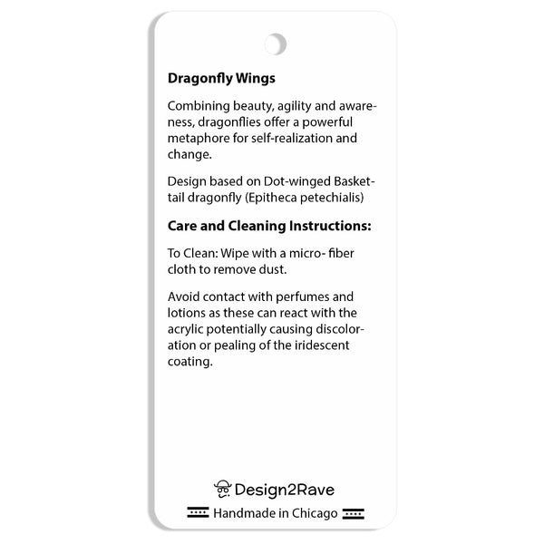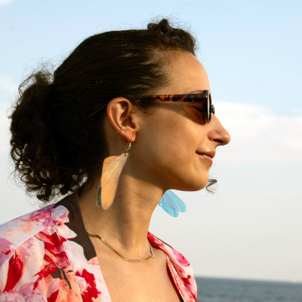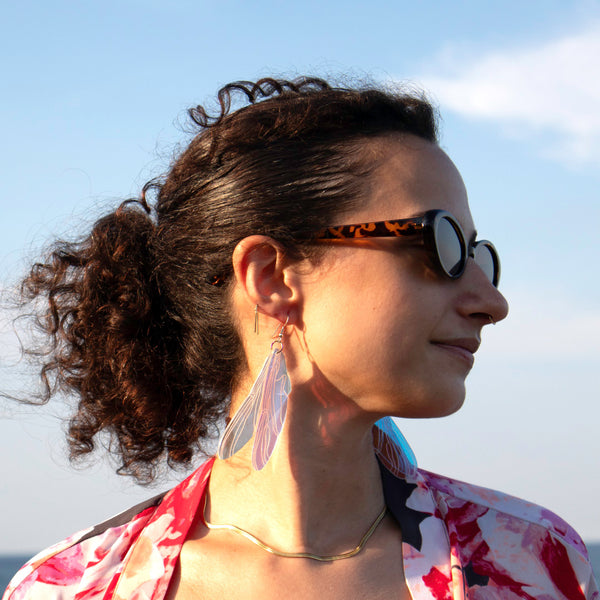 These lightweight iridescent acrylic earrings shift color and cast changing shadows in the sunlight. Made of lightweight 1mm iridescent acrylic for the front wing, and 1.6mm iridescent acrylic for the back wing, these earrings are almost weightless and the two wings on each earring flutter independently in a breeze.